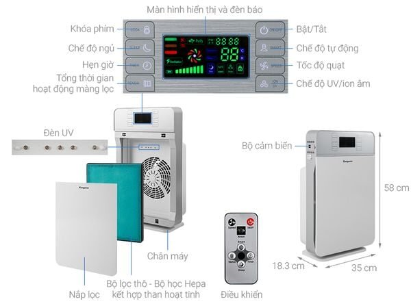 Máy lọc không khí Kangaroo có kết cấu hình khối chắc chắn, màu sắc trang nhã, tăng tính thẩm mỹ cho mọi không gian sử dụng
